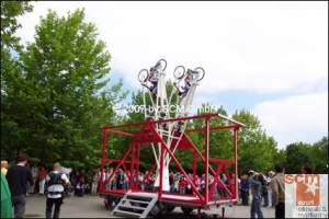 Zwei Fahrräder, montiert an einem soliden Stahlrahmen und mit einer hohen Übersetzung versehen, ermöglichen jedem Teilnehmer, ob jung oder alt, seine ersten Überschläge auf einem Bike. Gesichert durch ein Gurtsystem können die Kandidaten auch einmal am höchsten Punkt über Kopf verharren - immerhin auf über sieben Metern Höhe.