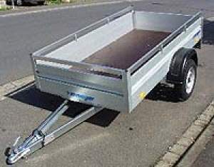 Beschreibung: Kleiner Anhänger ohne Plane. Die Ladefläche beträgt mind. 1,3 x 1 m und die Nutzlast mind. 400 kg.