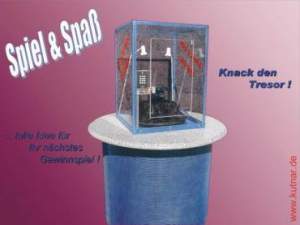 Beschreibung: Wer knackt den Tresor und holt den Gewinn heraus ? Im Inneren des Glastresors liegt ein Preis / Symbol Ihrer Wahl – z.B. ein Fahrzeugschlüssel, ein Goldbarren, eine Kaufvertrag einer Küche eine Reise als Gewinn oder.. oder.. oder- zum Greifen nahe !